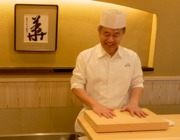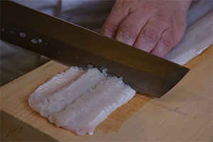 近海の幸には都度目を利かせ、時季を謳うネタを仕入れ、 夏なら淡路の鱧を「機を見るに敏」の如くカウンター前 にて骨切りをし、正に五感をもってお楽しみ頂きます。